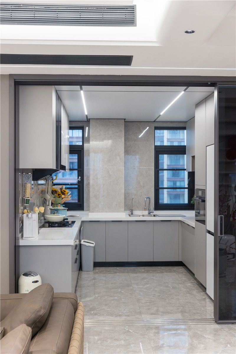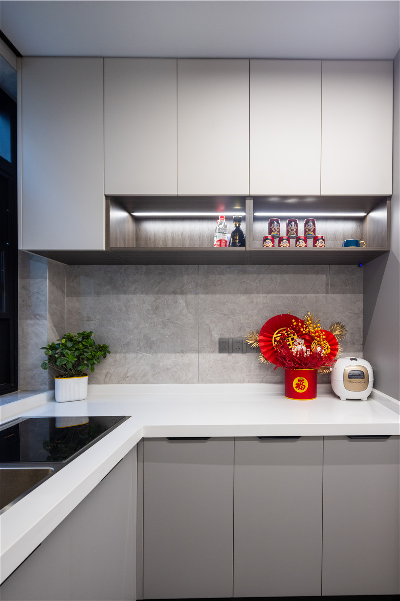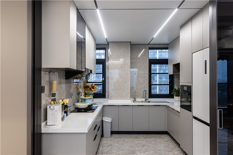 櫥柜以U型構(gòu)造合理利用空間,其灰調(diào)與白調(diào)配合,簡約好看。洗→切→烹→盛的動線,提升美食烹飪的效率。