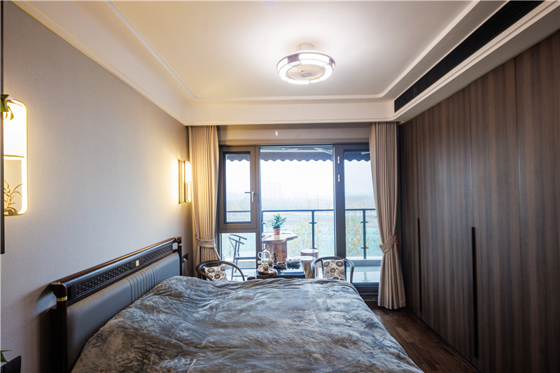 古典燈具+床頭板構(gòu)造彰顯雅韻;獨立陽臺+配套茶桌椅,悠閑生活輕松實現(xiàn);一字型頂天立地式衣柜,以合理分區(qū)滿足屋主的多重收納需求。