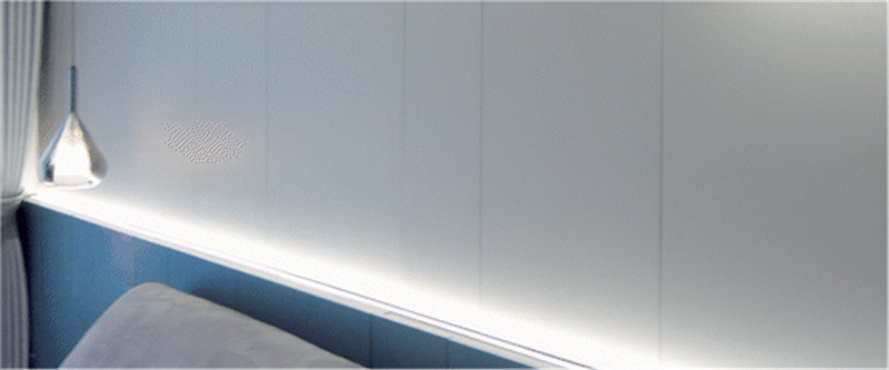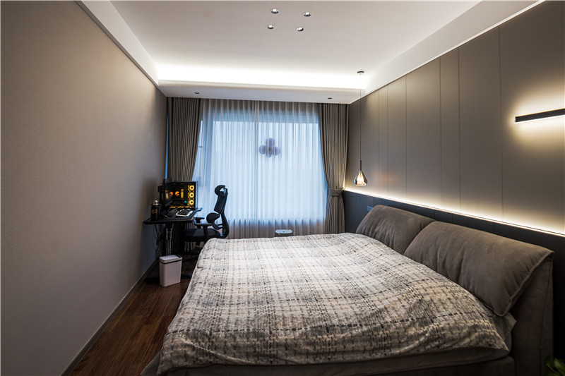 主臥床頭背景墻采用拼接設(shè)計,拼接處以燈光點綴,呼應(yīng)于藝術(shù)燈及局部燈光,滿滿氛圍感。