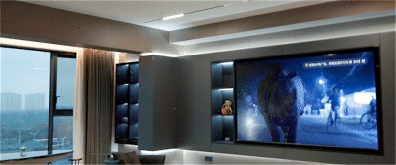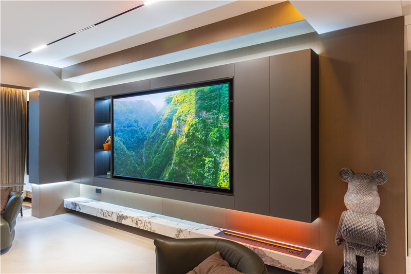 電視背景墻一體化設(shè)計(jì),通過顏色穿插彰顯個(gè)性化;電視機(jī)嵌入柜體中,與裝飾隔層相協(xié)調(diào),藏露結(jié)合;電視柜立體設(shè)計(jì),墻內(nèi)側(cè)嵌入燈光,以氛圍感突顯層次感。