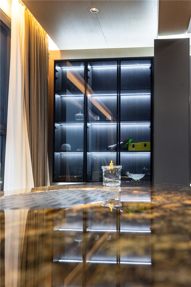 餐桌雙圓弧造型,配合以整面餐邊柜(中部掏空且預(yù)留軌道插座),木與玻璃的組合將收納力有效保障。