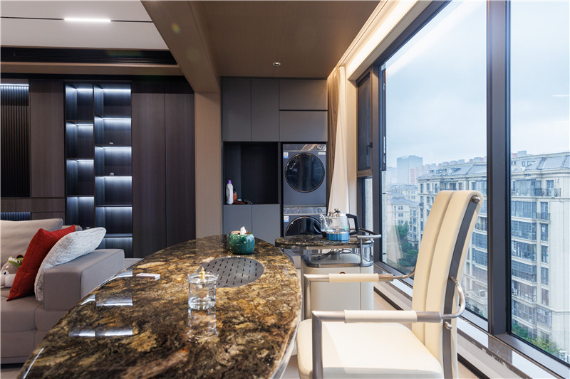 陽臺(tái)整體加入獨(dú)立式茶臺(tái),圓弧造型盡顯高級(jí)感,沐浴陽光、品茶靜思,真是一件美事。一側(cè)小型洗衣房構(gòu)造,分散家里的洗漱壓力。