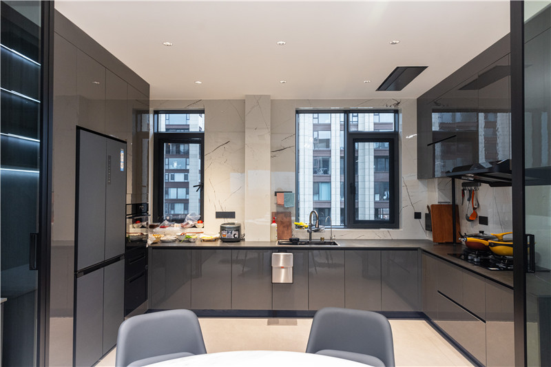 柜體以無拉手配合銑槽拉手,平整簡(jiǎn)約;一側(cè)柜體內(nèi)嵌烤箱、冰箱等電器,存儲(chǔ)力UP!櫥柜采用亮面門板、臺(tái)面為巖板,防水耐污能力強(qiáng)。