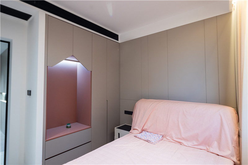 女兒房背景墻與衣柜一體化設(shè)計(jì),中部做房屋造型并以粉色點(diǎn)綴,顯活潑靈動(dòng),這樣的溫馨小屋太讓人心動(dòng)了吧~