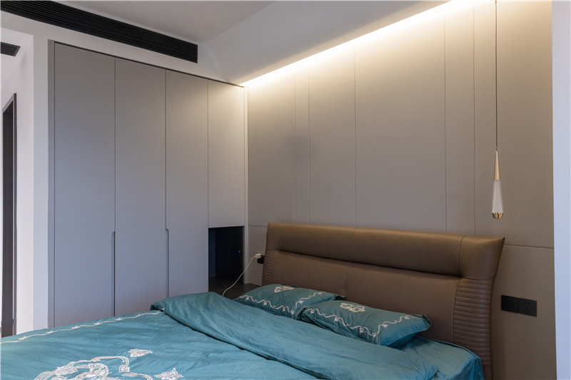 壁柜有效保障收納力、門板采用銑槽長(zhǎng)拉手、柜體延伸為床頭柜,簡(jiǎn)約實(shí)用;吊頂滿滿小心思,增強(qiáng)空間的光影感。