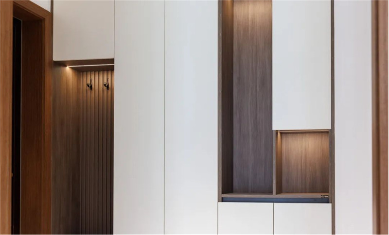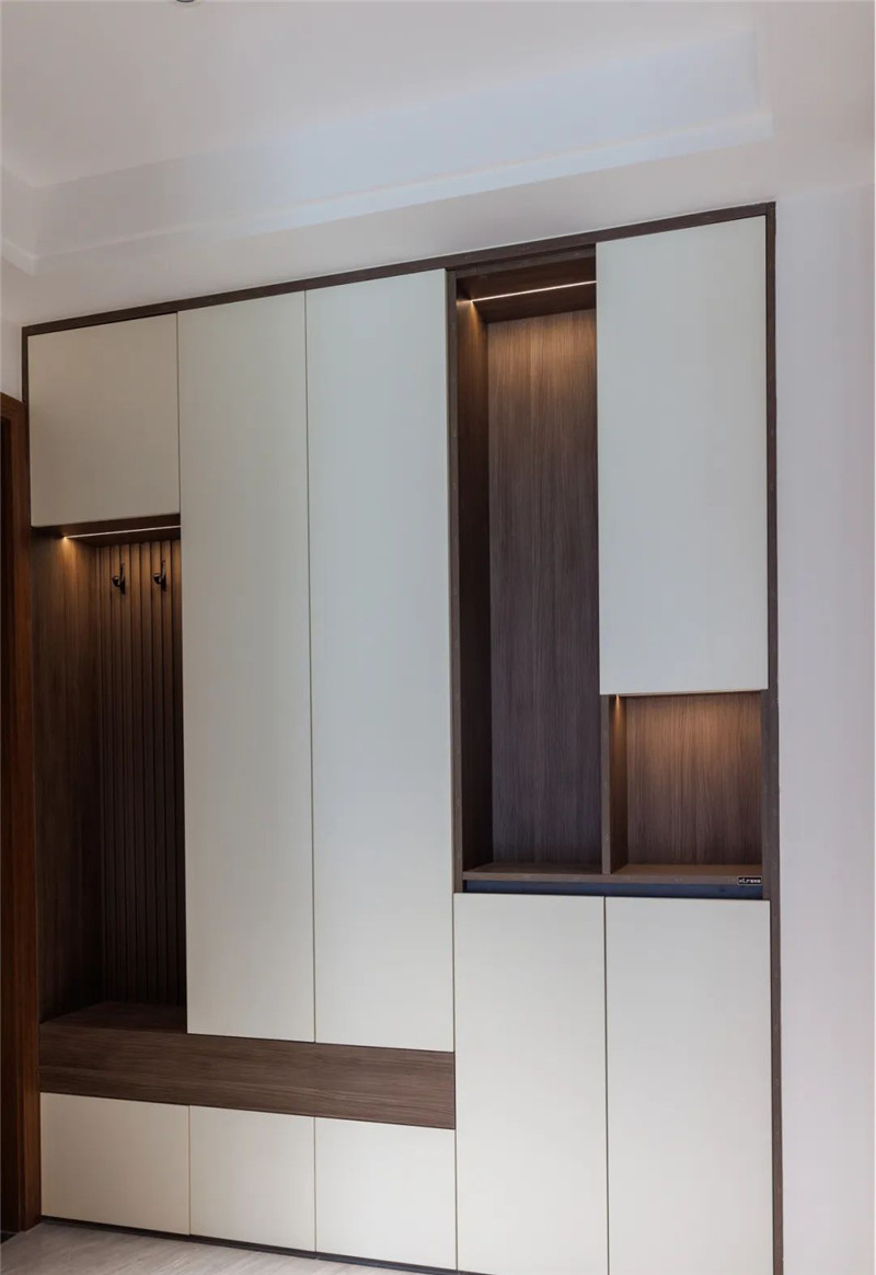 柜子設計:玄關柜一柜到頂既滿足收納需求,頂部空間也不用再打掃;功能分區(qū):利用深色穿插設計,將掛衣區(qū)與放鞋區(qū)隔開;封閉式與開放式掛衣、封閉式放鞋區(qū)更符合日常使用習慣。