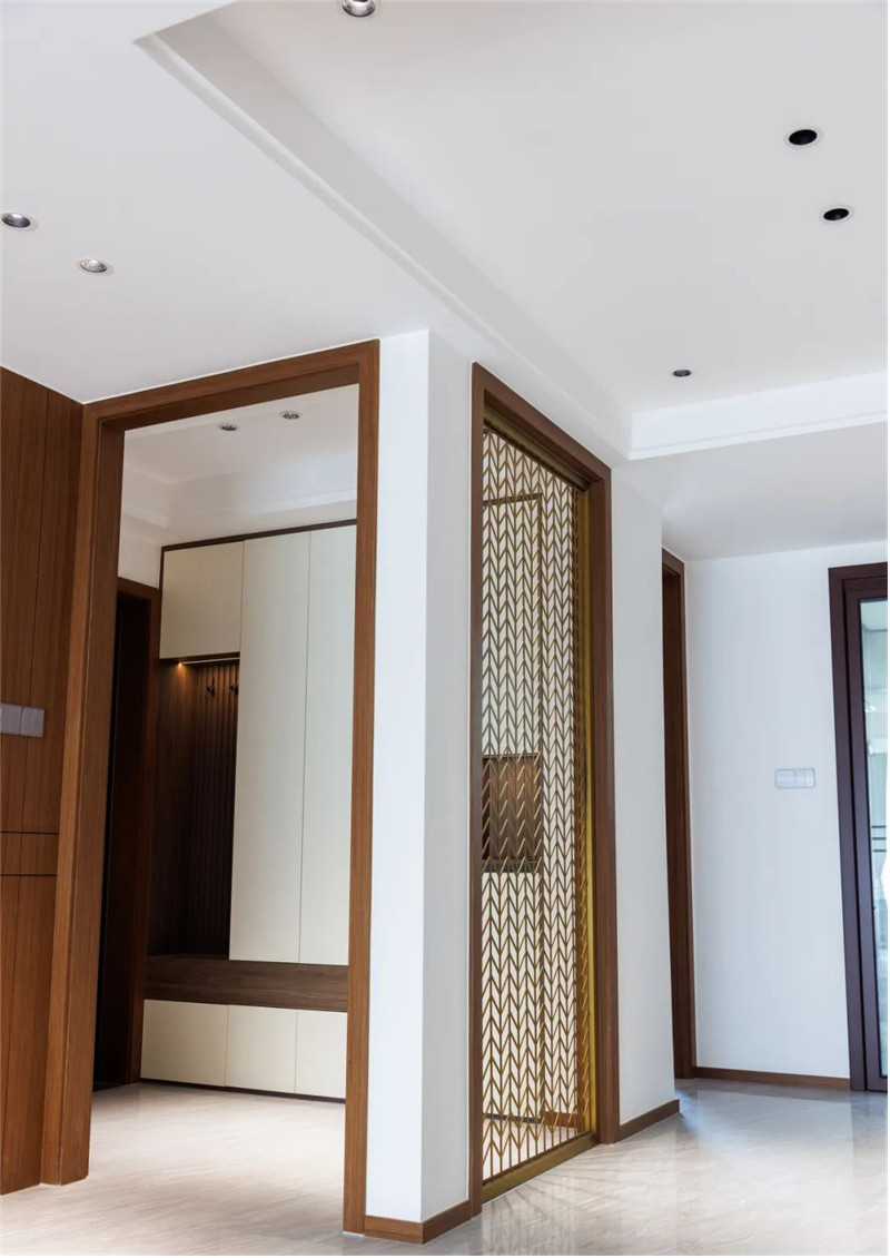 中式氛圍:采用中式常用到的格柵設計置于開放區(qū)背板,增加玄關柜設計感,整體簡約不失精致;在玄關與客廳銜接處采用格柵屏風,既起到空間分區(qū),呈現初步中式氛圍。