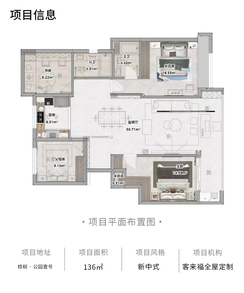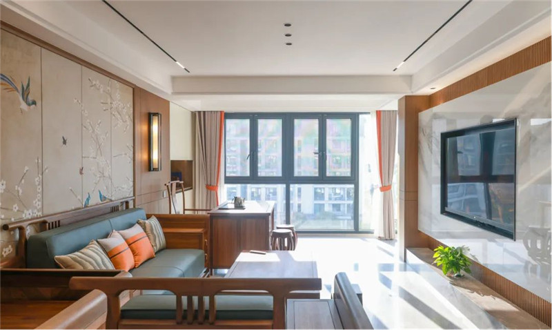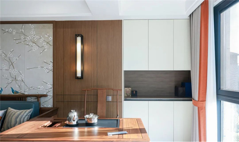 本案新中式風更貼近年輕人審美,使用簡約的設計手法滿足日常功能需求,儒雅的配色與裝飾構建濃厚中式風韻味,整體落地效果擺脫對新中式固有思維的“偏老氣”“偏俗氣”,空間氛圍集高級、大氣與雅致于一體。