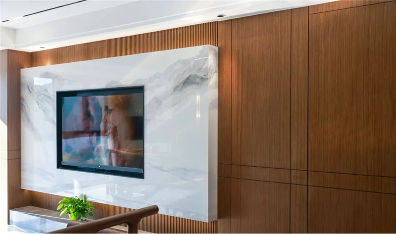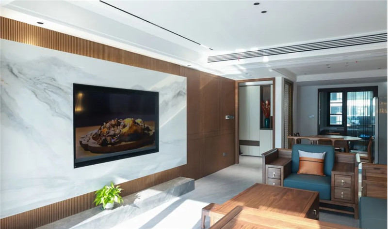 實木格柵、不規(guī)則拼接與懸浮山紋大理石構建成電視背景墻,畫面觀感令人舒適,古色古香;背景墻內含隱形門,巧妙的設計使空間顯大,和諧美觀。