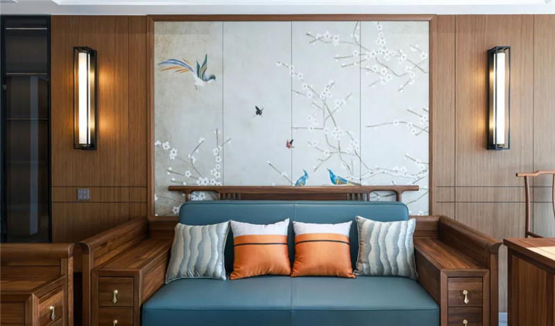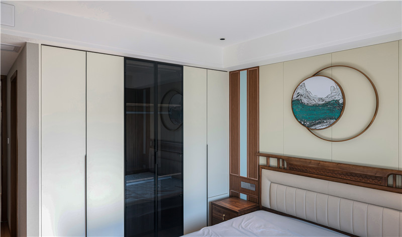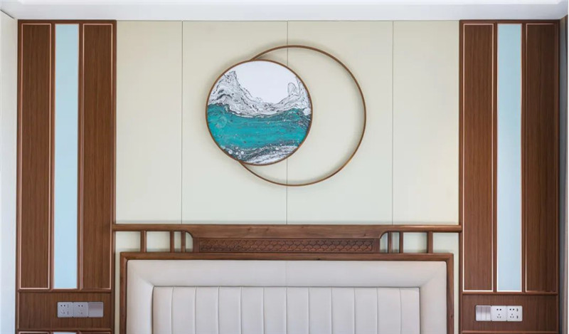 背景墻采用不規(guī)則拼接,實木與米白的配色經典和諧。背景墻中遵循了中式美學對稱,簡中有序,整個臥室洋溢著新中式意境。