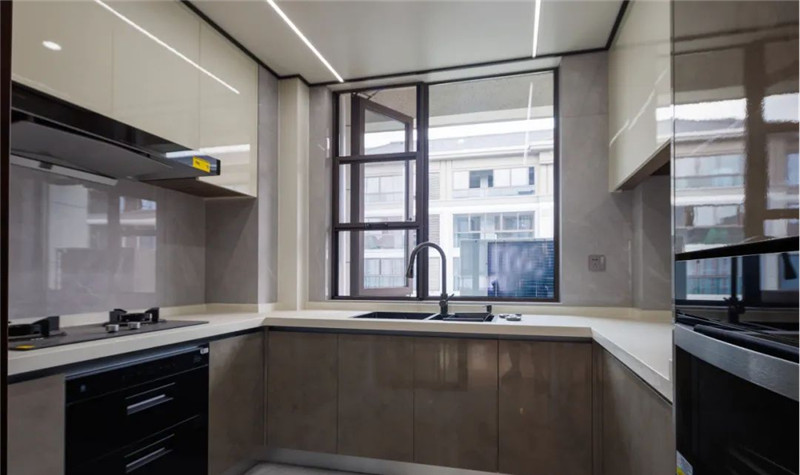 櫥柜柜體選用客來福橡木,吊柜柜門伊麗莎白,地柜為睿智灰,灰白色的搭配時尚簡約。