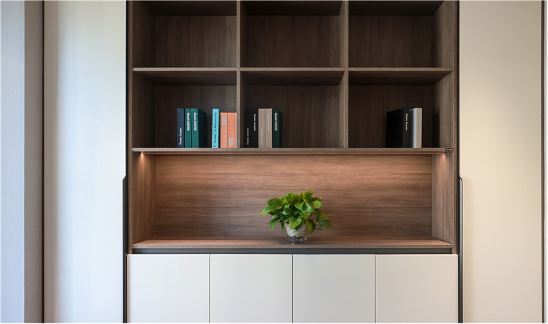 書房書柜設置了更多開放區(qū),用來擺放書籍、藝術品、手辦等物品,方便拿放的同時也增加了柜子的顏值。