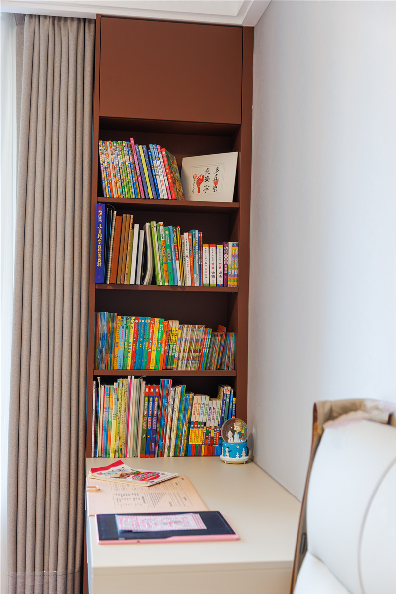 靠窗做小區(qū)域書(shū)柜,柜體延伸為床頭柜,可做書(shū)桌、梳妝臺(tái)使用;室內(nèi)柜體合理分區(qū)、飄窗區(qū)作為閑適區(qū),整體溫柔好看。