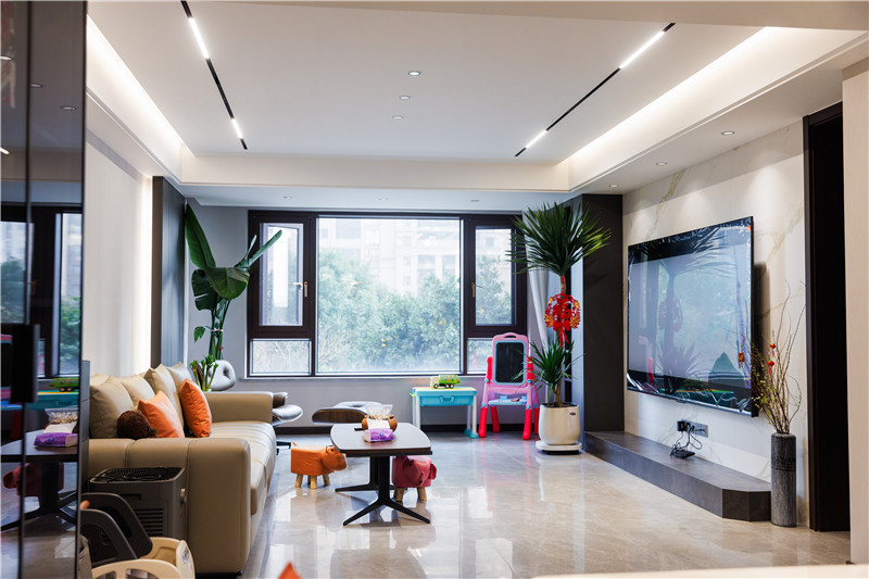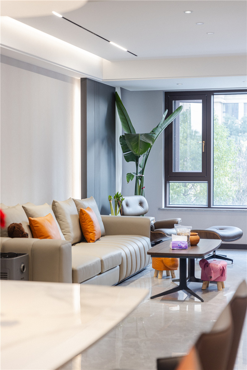 電視底座一字型底板造景平行沙發(fā),協(xié)調(diào)呼應(yīng);沙發(fā)背景墻采用整塊凸起造型板,內(nèi)嵌以燈光,無(wú)主燈設(shè)計(jì)增強(qiáng)空間氛圍感。