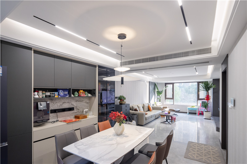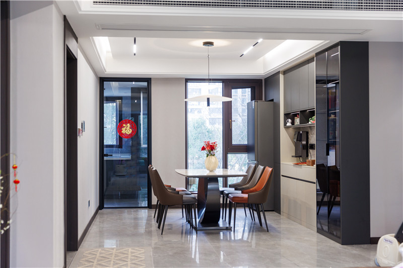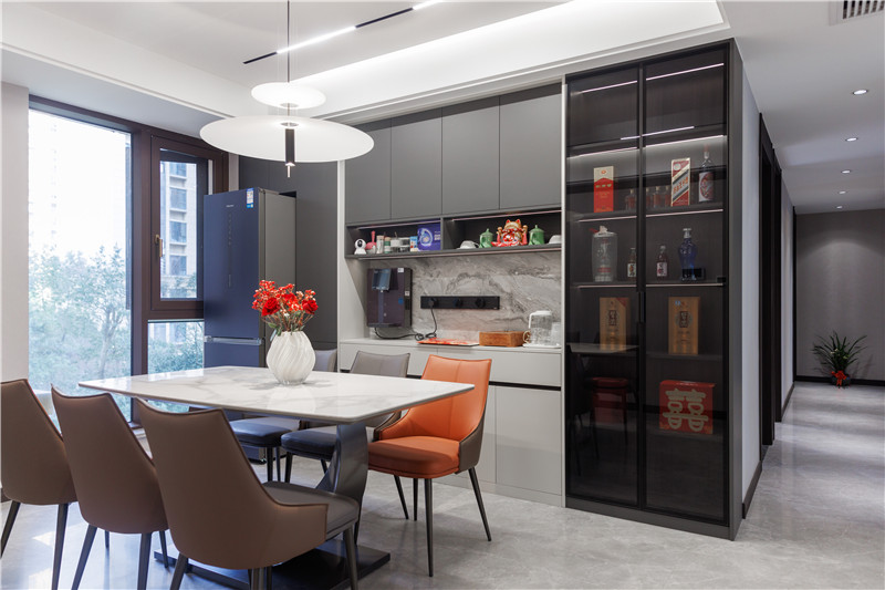一側(cè)冰箱嵌入立柜中,視覺(jué)上協(xié)調(diào);一側(cè)設(shè)置窄邊黑框灰玻裝飾柜嵌入燈帶,是家里的風(fēng)景線;餐邊柜上下柜呼應(yīng)、中部加入大理石紋背板,整體與餐桌椅配套。