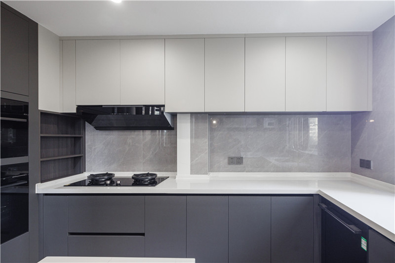 櫥柜為水洗灰門板,內(nèi)嵌烤箱等電器,節(jié)約空間;臺(tái)面巖板耐刮防滲水,臺(tái)下盆設(shè)計(jì)更方便打理;洗切烹盛動(dòng)線,優(yōu)化空間。