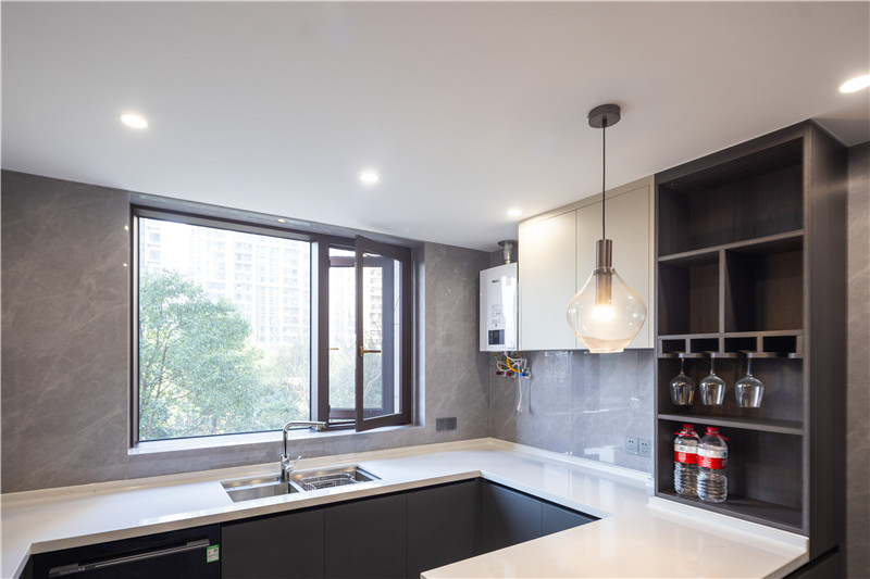 廚房整體小U型構(gòu)造,貼墻而建有效利用家里的小空間,其大窗戶有效保障室內(nèi)的采光,主燈與輔燈結(jié)合式設(shè)計(jì),使得烹飪時(shí)視覺(jué)效果好。