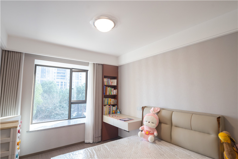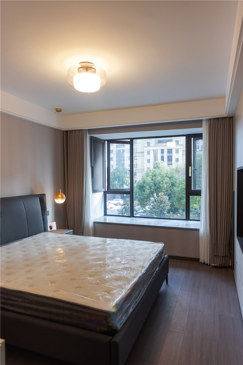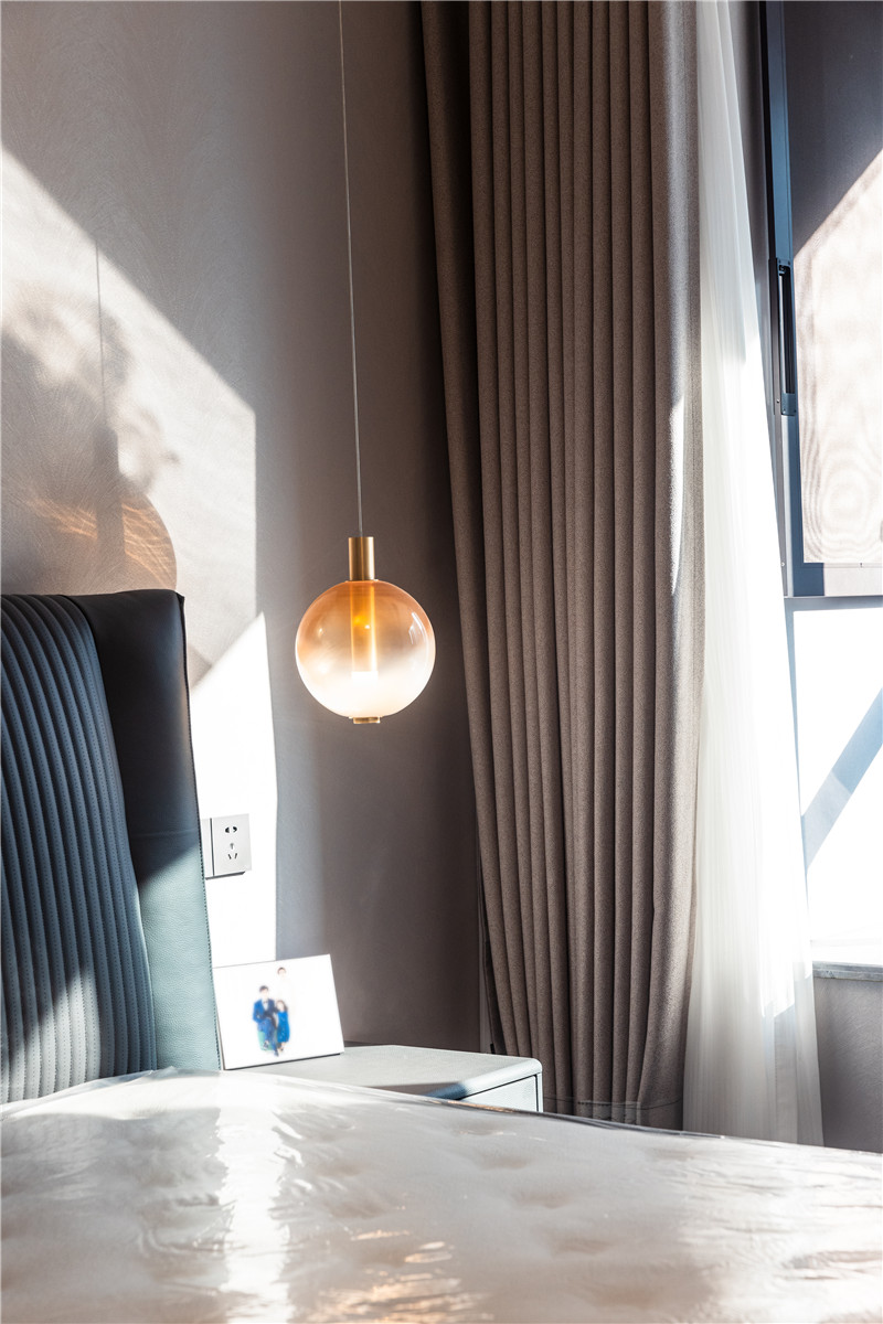 主臥水漆茶白與藍(lán)咖啡色配合,低調(diào)沉穩(wěn)且不失新意;整體主燈與藝術(shù)床頭燈配合,滿足日常起居需求;雙窗簾透光不透人,居家更安全。
