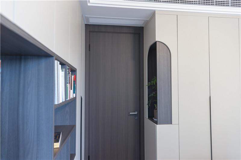 主臥進(jìn)門立柜以黑色簡(jiǎn)約長(zhǎng)拉手突顯線條感,側(cè)邊圓弧造景展現(xiàn)高定氣質(zhì),內(nèi)部掛疊結(jié)合式設(shè)計(jì)滿足多種收納需求。