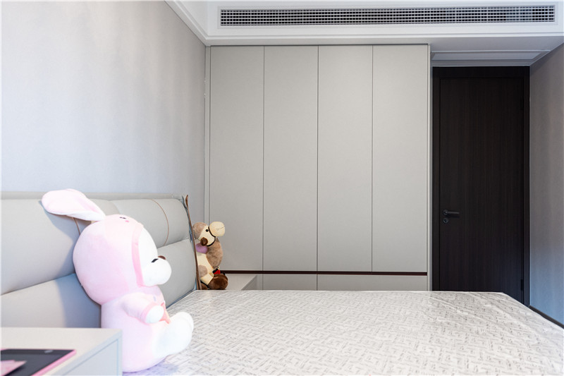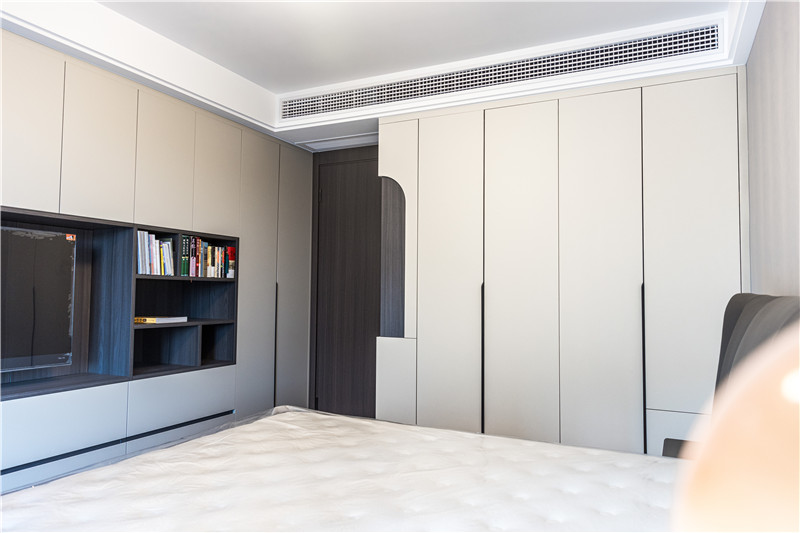次臥滿足了功能上的生活需求,進(jìn)門一字型立柜,水漆茶白門板+無(wú)拉手設(shè)計(jì),簡(jiǎn)約利落。