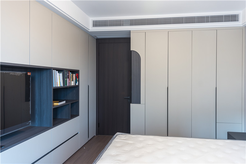 床頭整面電視背景墻為組合柜設(shè)計(jì),藏露結(jié)合,家常放置及不常用物品收納都可在這里實(shí)現(xiàn)。