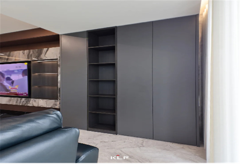 沙發(fā)背景墻被打造成整面收納柜,開放與封閉的組合設計,讓收納與展示完美融合。