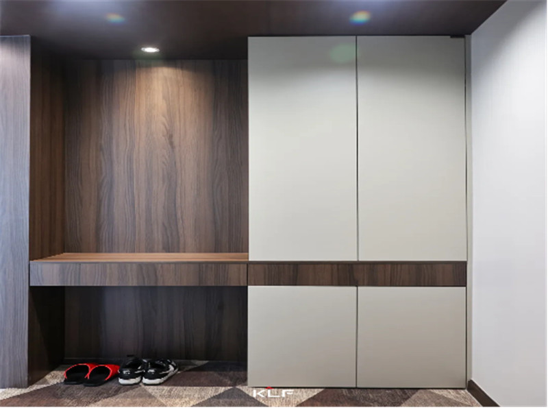 玄關造型充滿歸家的儀式感,靠墻進門一側做穿插式設計,木色與白色融合,柔和色調營造舒適自由的居心之所。