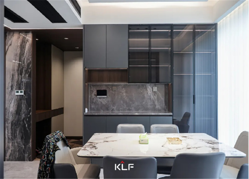 整面餐邊柜立于大理石餐桌一側,儲物及展示功能拉滿的同時,線條和形式的韻律演繹出現(xiàn)代化的家居美學。色調柔和、質感高級的水漆柜搭配上通透玻璃,清新淡雅,營造典雅雋永的氛圍。