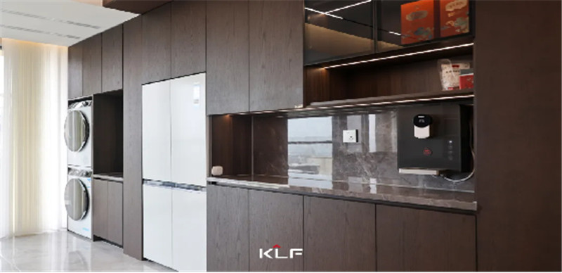 純木色無拉手一門到頂柜,局部選用巖板、玻璃進行點綴,高級感拉滿。嵌入式設計容納了冰箱和洗衣機烘干機,精簡的設計,給予居者更豐富的視覺感受。