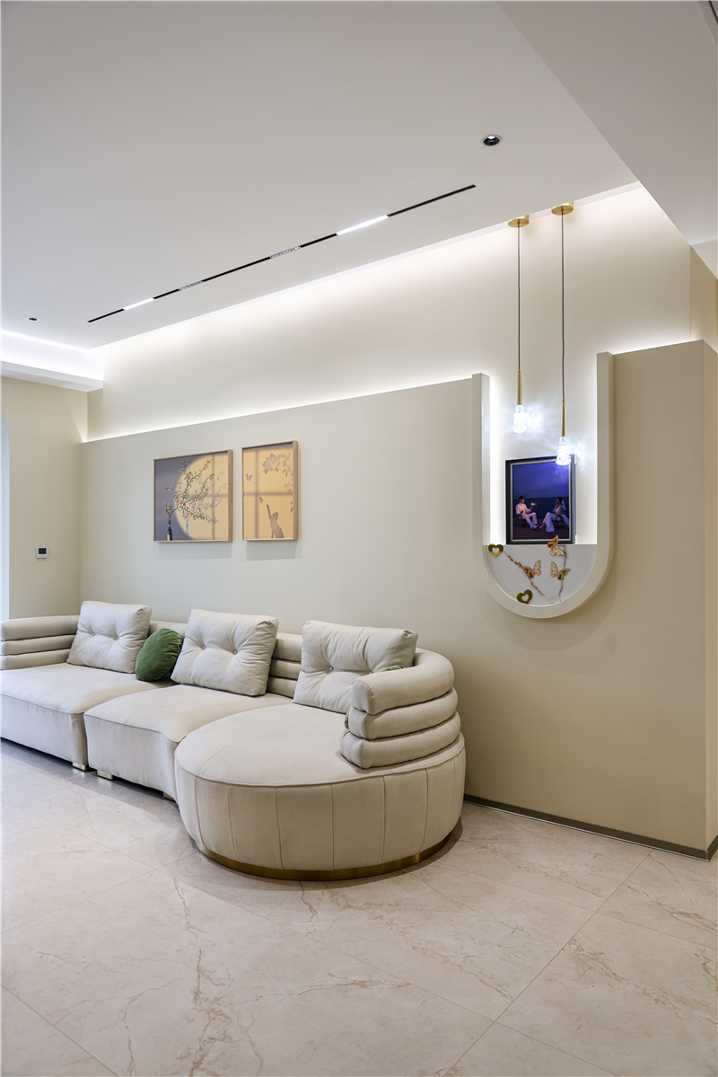 懸浮電視背景墻上延續(xù)弧形設(shè)計(jì)