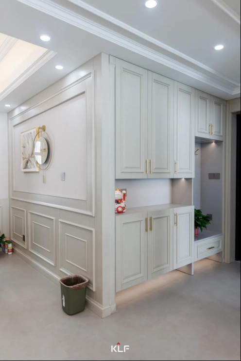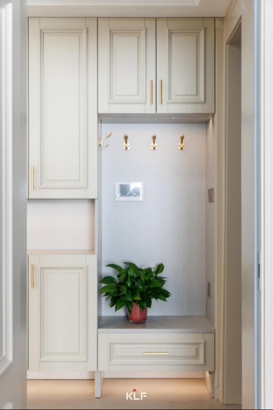 玄關(guān)入戶柜簡約純凈,在設(shè)計(jì)上采用“二八”原則,掛衣區(qū)、換鞋區(qū)精心布局,搭配頂部收納柜、鞋柜增加儲物功能。