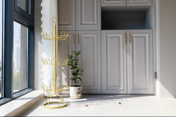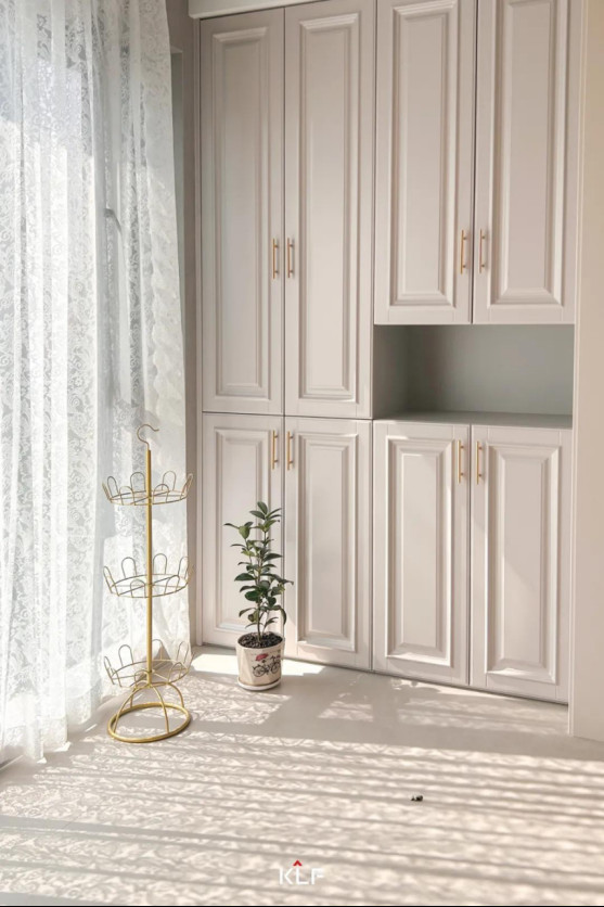 靠墻設(shè)計(jì)的水漆茶白陽臺柜兼顧收納和顏值,整墻簡約金屬拉手收納柜讓生活瑣碎變得井井有條,縱向立體化收納,搭配中間開放設(shè)計(jì),可放置日常用品,便于拿取。