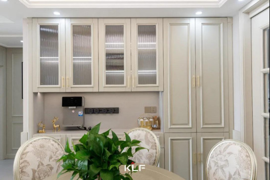餐邊柜高級大氣,儲物收納和展示區(qū)域,劃分明確。側(cè)邊收納柜和地柜安置日常物品,頂部半透玻璃柜做展示使用,可放置書籍、手辦或美酒,既美觀又不失格調(diào)。