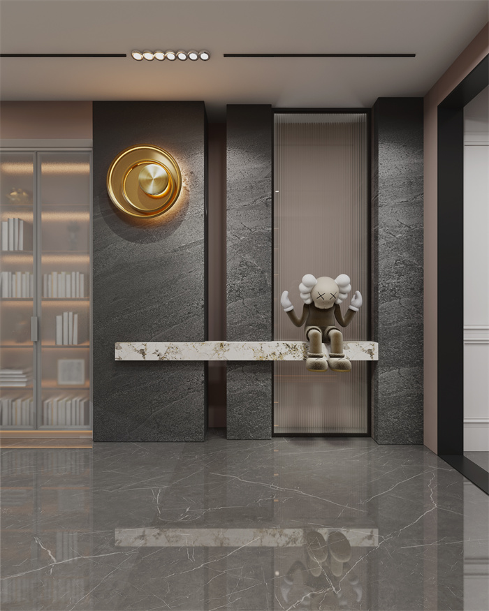 ?戶空間造景區(qū)與鞋柜相互呼應,精致的?虹玻璃作為情緒與視覺的點睛,填充空間空?的同時,也衍生出生活美學的設計感與儀式感。