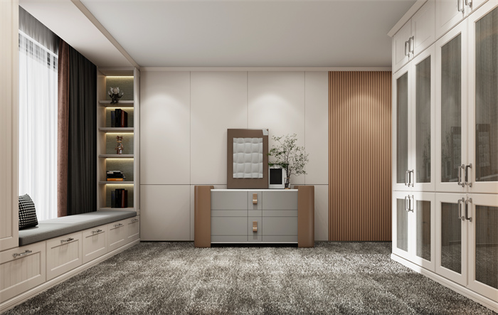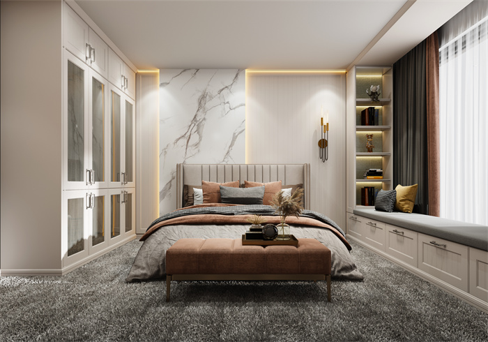臥室的柵格背景墻和模壓護墻,做出了?定混油的產品效果,超晶板和巖板等超現代感的元素的融入, 更是將簡歐這?經典風格產品做了顛覆,更符合當下消費?群讓客戶生活更加自然。