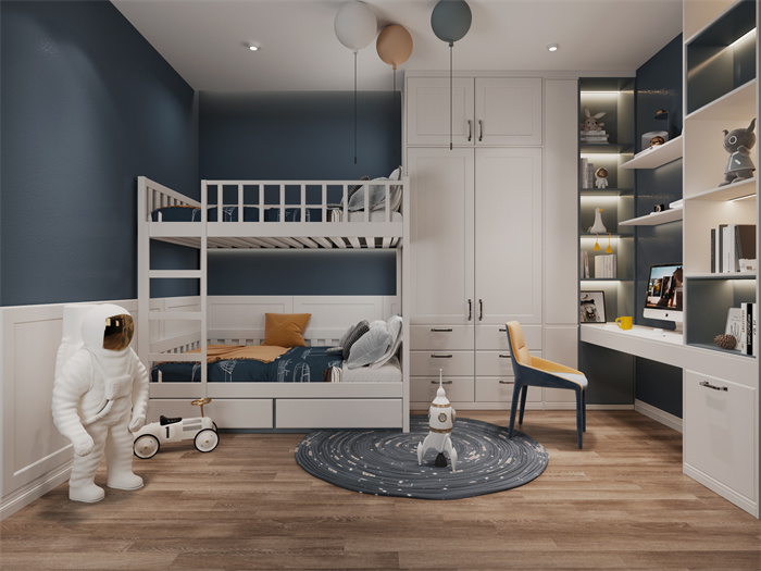 兒童房空間延伸了設計的?彩主題,不同飽和度的藍色配合深邃的星空藍,冷靜并充滿思考,L形的設計也被充分利用。