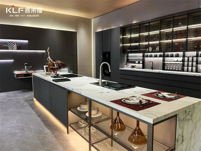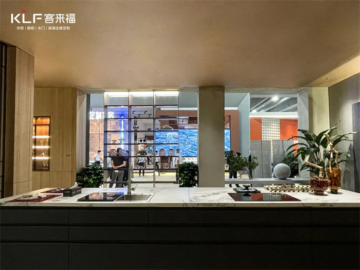 將客廳與開放式廚房打造成整體空間是升級的亮點(diǎn)之一,PET的工藝幫助我們實(shí)現(xiàn)嵌入式的內(nèi)置功能,比如衛(wèi)生間的燈光和冰箱。除此之外,整家定制也是客來福今年的著力點(diǎn),多功能的產(chǎn)品柜和開放式的設(shè)計模糊了空間界限。根據(jù)消費(fèi)者對于一站式一體化的消費(fèi)需求提供了解決方案。