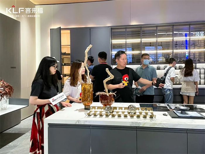 尹其宏董事長介紹道:客來福在此次展會、也是在行業(yè)內(nèi),首次重磅推出水漆實(shí)木系列產(chǎn)品。最值得一提的是“天琛”系列色板的水漆半透工藝。從制作工藝上講,采用了目前行業(yè)內(nèi)最領(lǐng)先的半透工藝——“見木不見漆”,木飾面與膚感PET的結(jié)合櫥柜。從水漆入手,水底水面,采用實(shí)木材質(zhì),看得到木皮但看不到油漆,近看可以清晰看出木紋通透的紋理感;0度膚感的觸覺,體驗(yàn)進(jìn)一步升級了產(chǎn)品的質(zhì)感。