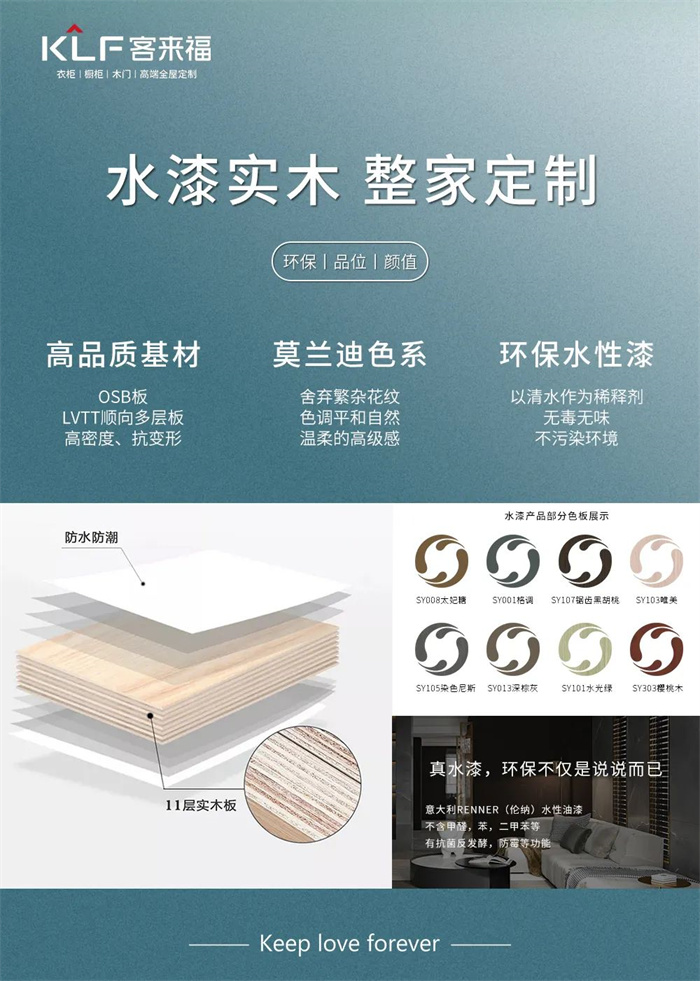 客來福產(chǎn)品全部符合國標,針對水漆產(chǎn)品也有了多款裝修案例。如:莫蘭迪色系+水漆工藝的意式輕奢風:墨奈系列,中國紅+水漆工藝的新中式混搭風:天琛系列,克萊因藍+水漆工藝的新中式混搭風:革物·KOLON卡倫系列(9月5日揭曉),但無論是哪一款,都有觸人心弦的魅力。