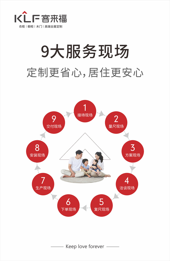 此外,客來福還以接待,量尺,方案,洽談,復(fù)尺,下單,生產(chǎn),安裝,交付九大服務(wù)現(xiàn)場保障廣大客戶的“幸?!鄙?。