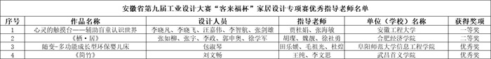 通過(guò)專項(xiàng)賽評(píng)審,根據(jù)評(píng)審結(jié)果,現(xiàn)將安徽省第九屆工業(yè)設(shè)計(jì)大賽“客來(lái)福杯”家居設(shè)計(jì)專項(xiàng)賽獲獎(jiǎng)作品名單予以公示。