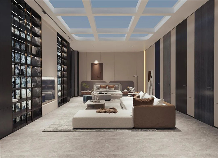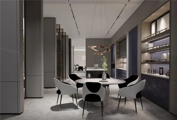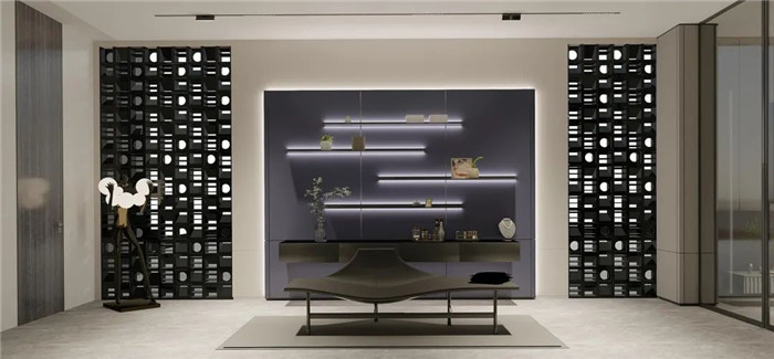 產品囊括了客廳、臥室、餐廳、衣帽間、書房等空間,讓家不僅僅是居住地,更是享受生活的地方??蛷d采用了一柜到頂?shù)娜X框架電視柜,背面搭配云石燈背景,簡約而不簡單;衣帽間采用時尚科技的電動平移巴士門,于細節(jié)之處彰顯魅力;餐廚空間墻面墻板整包,給人舒適溫馨之感;簡約式懸挑書柜設計搭配烤漆工藝超薄帶燈層板,氛圍感十足。