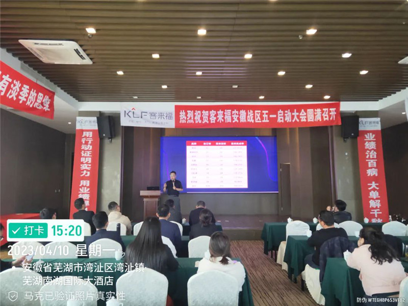 2023年4月10日,客來福安徽戰(zhàn)區(qū)五一啟動大會于蕪湖圓滿召開,安徽戰(zhàn)區(qū)總監(jiān)姚磊與安徽戰(zhàn)區(qū)經(jīng)銷商齊聚本次大會,共同商討五一活動等相關(guān)事宜。