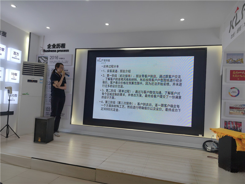 本次活動(dòng)以主持人帶領(lǐng)大家宣讀企業(yè)文化拉開(kāi)序幕,接著佛山工廠(chǎng)負(fù)責(zé)人就工廠(chǎng)近期新工藝發(fā)貨流程進(jìn)行講解,幫助各位經(jīng)銷(xiāo)商深入了解產(chǎn)品知識(shí)。