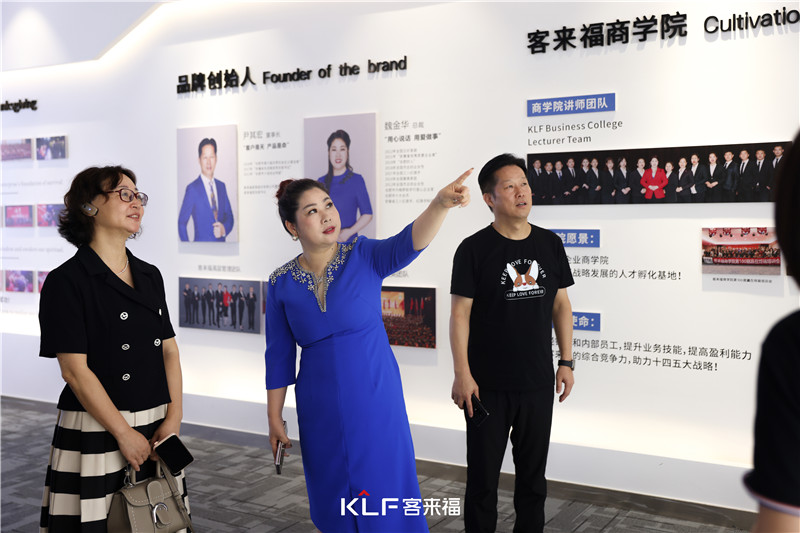 走到文化長廊時,眾人一起感受客來福的文化底蘊,并通過觸摸板材體會水漆產(chǎn)品的質感;走到2023年新落地的13代展廳時,品牌元素的融合設計,讓人眼前一亮。