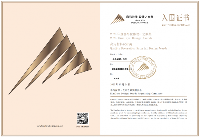 近日,2023年喜馬拉雅?設(shè)計(jì)之巔獎隆重盛啟,客來福定制家居受邀參與評選,在近千幅參評作品中脫穎而出。旗下作品“蝶變”系列入圍定制家居設(shè)計(jì)獎、作品“臻·至系列”入圍居住空間設(shè)計(jì)獎、作品“水晶蝴蝶”拉手入圍高定材料設(shè)計(jì)獎,得到了評審的一致好評。實(shí)力彰顯中國品牌設(shè)計(jì)力量。