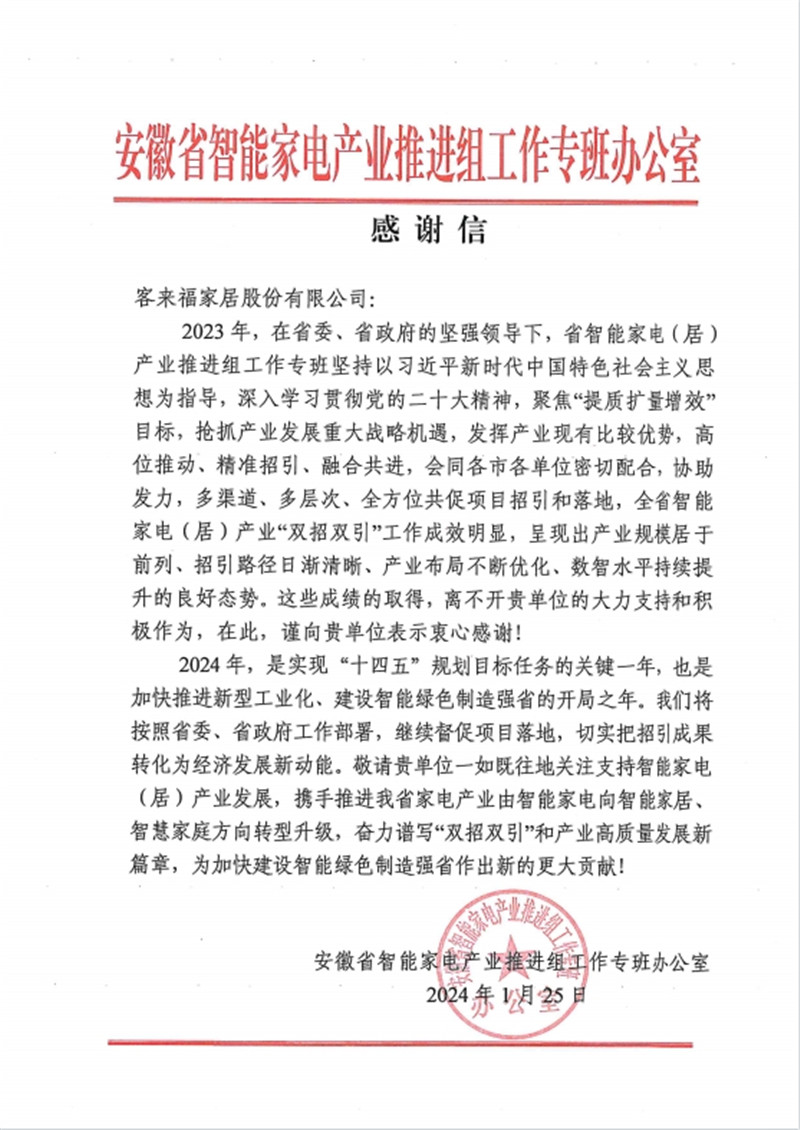 安徽省智能家電產(chǎn)業(yè)鏈推進組工作專班辦公室感謝客來福家居助力智能家電(居)產(chǎn)業(yè)發(fā)展
