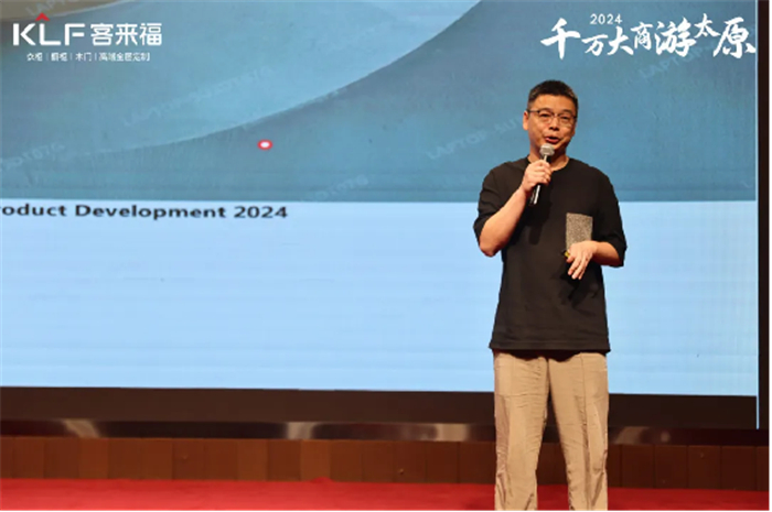 尹董指出,面對市場低品質價格內卷現狀,要?敢于破局,堅持以輕高定方向為主的產品創(chuàng)新,繼續(xù)以水漆爆品為發(fā)力點進行反內卷探索。在現場,尹董為與會者解讀營銷重構,結合案例進行抖音渠道分析。他指出,在自媒體營銷時代,客來福必須緊跟潮流,抓住機遇,從單一的地面營銷變成雙網營銷,利用短視頻打造流量矩陣,做好品牌宣傳。