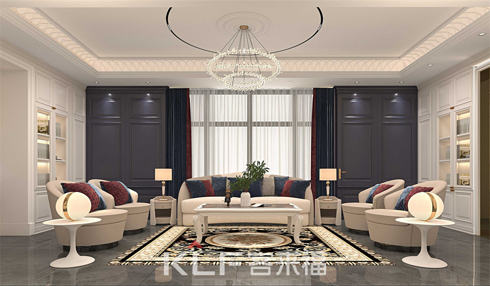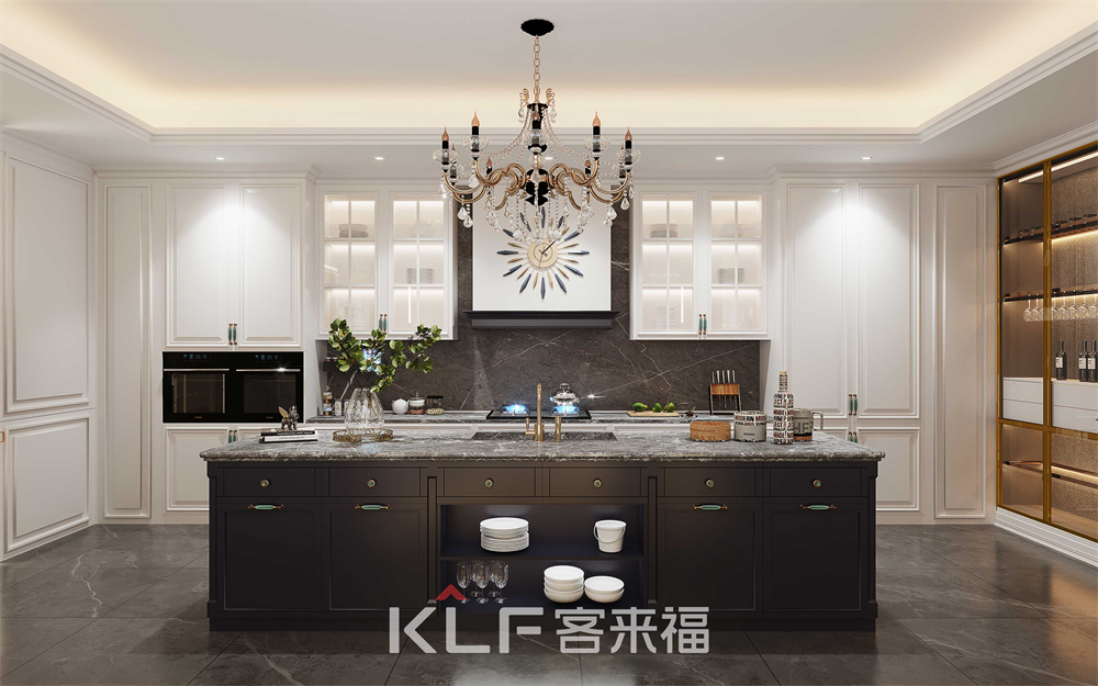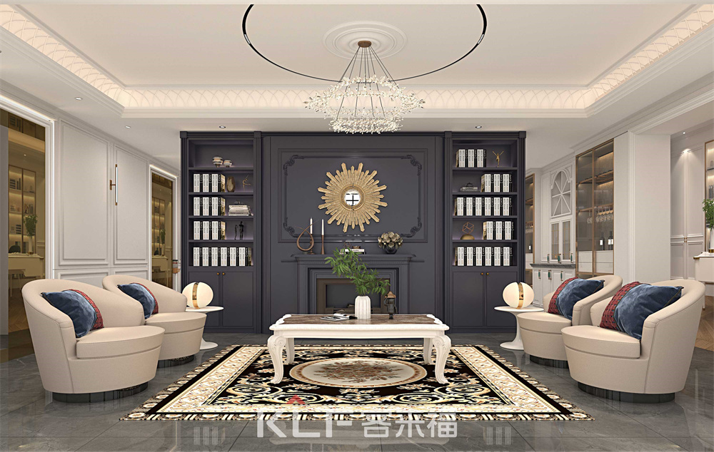 超長的中島臺(tái),采用古典邊型的石英石臺(tái)面,灰藍(lán)色整體配色沉穩(wěn)大氣,餐邊柜采用巖板背板,是古典混搭系列的點(diǎn)睛之筆,客廳空間同樣采用雙色配套,壁爐柜的使用更是時(shí)下豪宅的標(biāo)配。