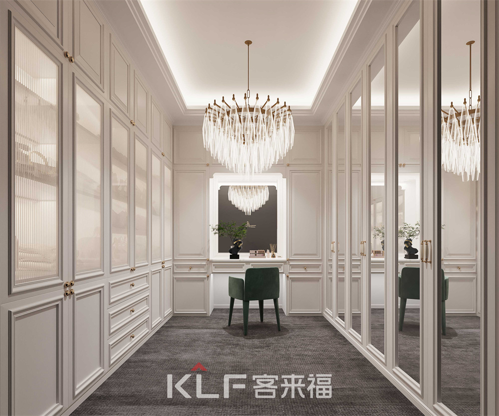 衣帽間配備雙開玻璃門,長虹玻璃搭配銀鏡的衣柜門板組合,將整個(gè)古典衣帽間功能分區(qū)更加合理,太陽花金色拉手的使用,既能體現(xiàn)古典產(chǎn)品的元素特征,同時(shí)也是現(xiàn)代感極強(qiáng)的一種體現(xiàn)。